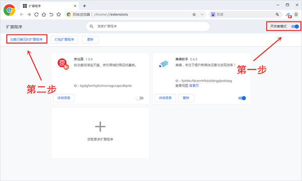 5、等待扩展程序和右上角显示图标就说明插件安装成功了,其他浏览器也是同理,重点就是【扩展程序,在打开开发者模式,在点击“加载已解压的扩展程序”】,