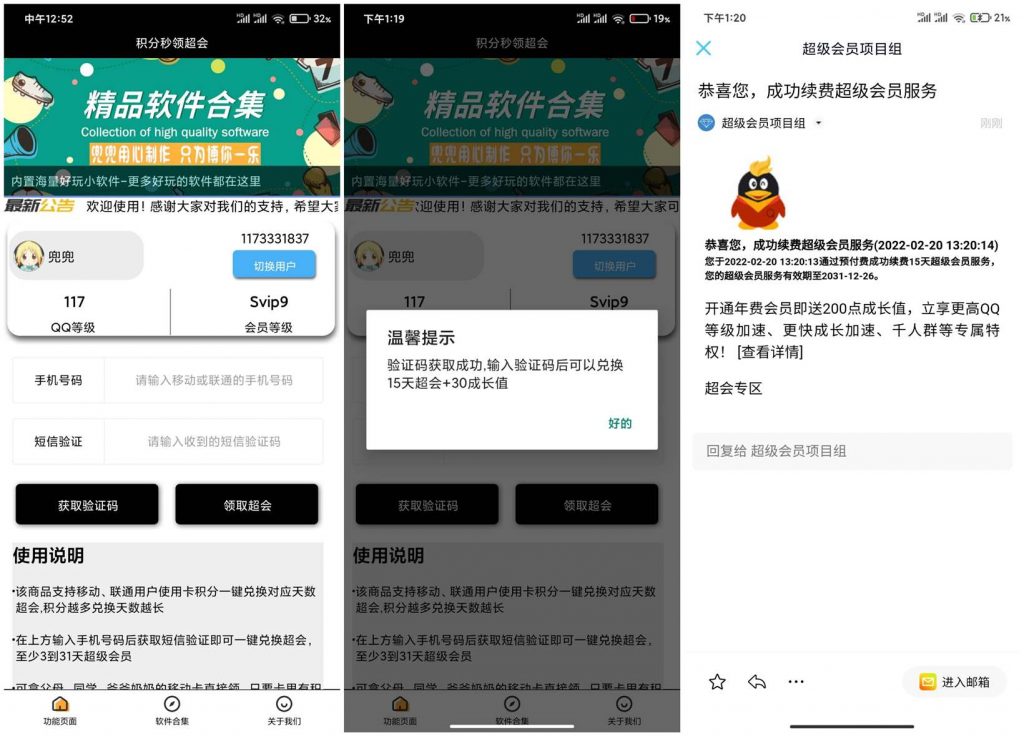 最新可白漂超会的软件来了,软件支持移动、联通用户使用积分一键兑换对应天数超会,积分越多兑换天数越长,可拿父母、同学、爷爷奶奶的手机卡直接领,只要卡里有积分可以一直领,无限制,每次至少能兑换3到31天