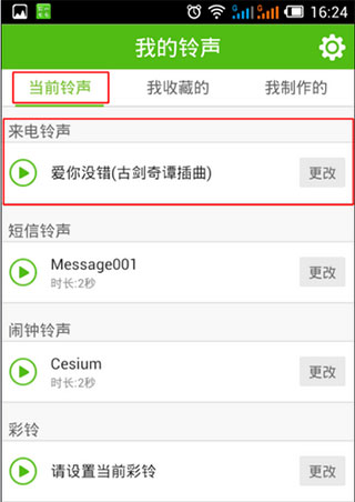 1、进入我的铃声页面后再点击“当前铃声”-“来电铃声”,如果你不喜欢当前的铃声,然后点击“更改”;