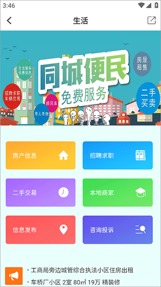 2、生活页有房产信息,求职招聘,二手交易,信息发布等