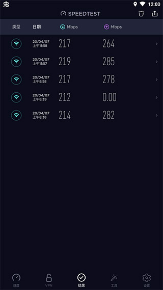 4、点击下方菜单栏的“结果”选项,可以查看到历史的测速信息。