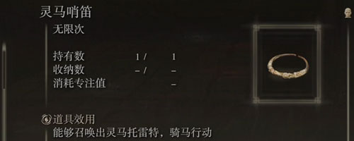 在《艾尔登法环》的网络测试版中,坐骑需要触碰一定数量的赐福(篝火),触发和梅琳娜的剧情之后,就可以获得灵马哨笛,佩戴在道具栏中,就可以召唤出灵马。灵马有单独的血条,在骑行灵马时,可以进行战斗,并且还可以二段跳。