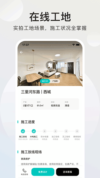 全流程数字化管理,工期/费用/品质/风格稳定可控。核心主辅材溯源保真,真材实料看得见,全程无需跑工地,每日播放更省心。