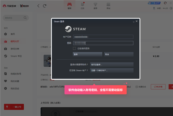 答:开通快速上号的货架,租客下单后点击一键上号进入游戏哦,不需要账号密码,非常简单方便的呢