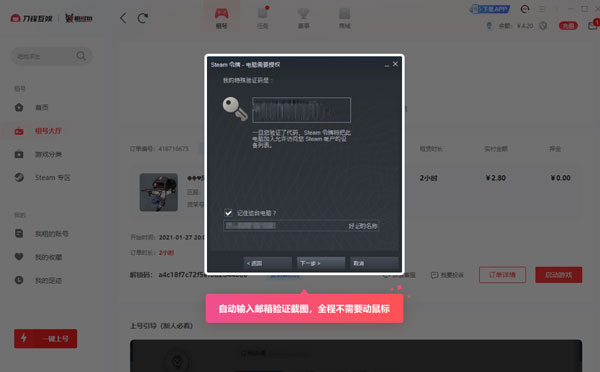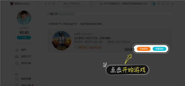 答:租客通过租号玩苹果APP-“刀锋平台”,下单后一键上号进入游戏。