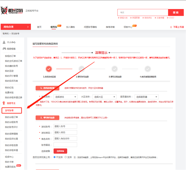 2、点击我是号主,选择发布账号,选择你想要出租的游戏账号信息,如角色名、账号等级、装备等等,最后填写出租星系,点击发布即可。