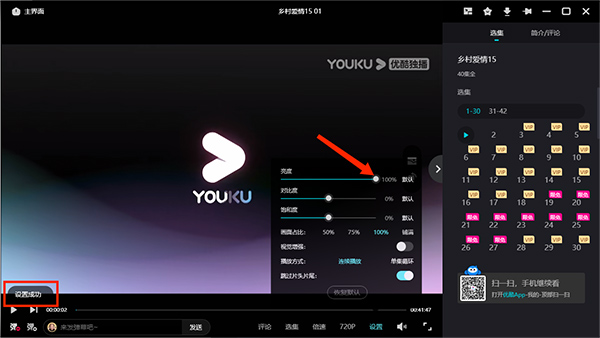 2、进入视频播放界面,鼠标移动到“设置”选项,可看到亮度调节按钮,