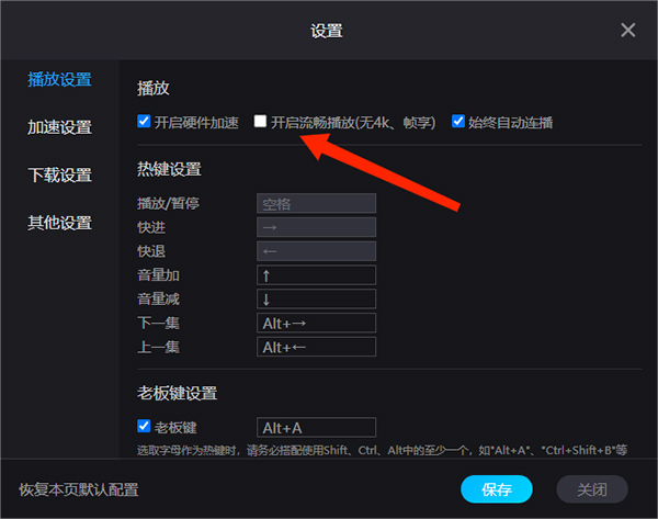 1、选择“设置”选项,在播放设置界面,取消勾选“开启流畅播放”选项。