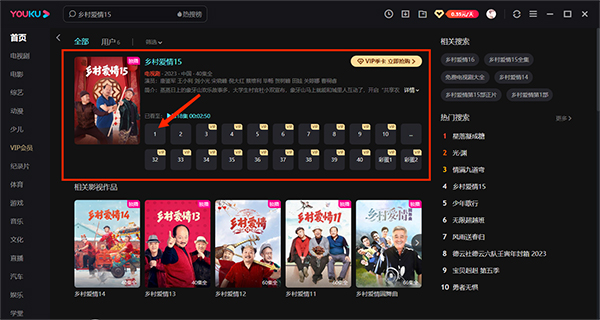 1、打开优酷pc客户端,在左上方“搜索框”输入想要下载的视频名称,这里以乡村爱情为例,