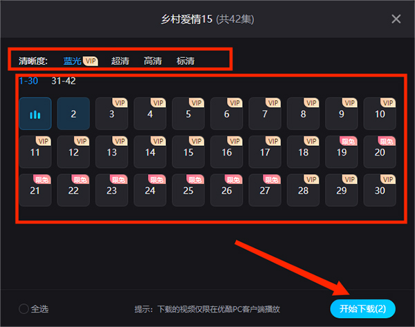 4、进入视频下载界面,勾选需要下载的视频集数和清晰度,选择右下角“开始下载”即可开始下载视频。