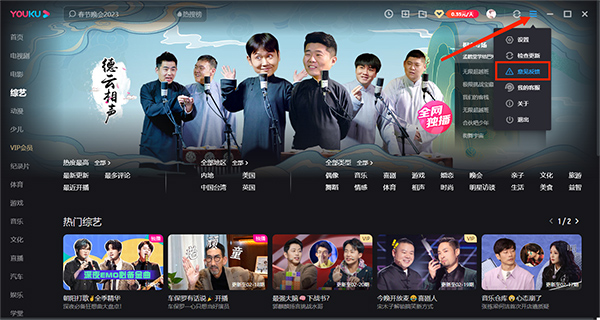 1、打开优酷电脑客户端,鼠标移动到右上方“三条横线”图标,选择“意见反馈”选项,